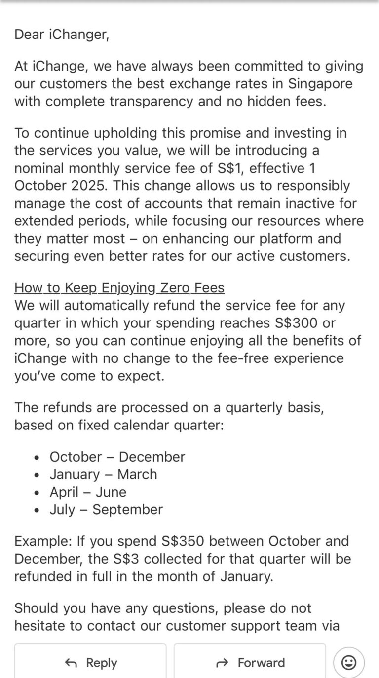 “As informed, the S$1 refundable service fee was automatically deducted by the system. Once you spend S$300 (SG or overseas) using our card in a quarter (Oct, Nov, and Dec 2025), this fee will be automatically refunded to your wallet in Jan 2026.”